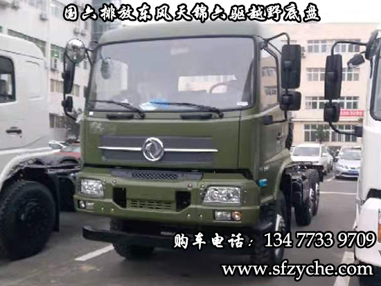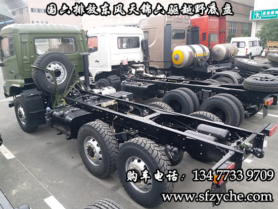 國六排放東風(fēng)天錦六驅(qū)越野底盤,東風(fēng)天錦D530一排半駕駛室,6×6驅(qū)動,康明斯B6.2NS6B210國六發(fā)動機210馬力,最大扭矩:850N.m/1100-1700rpm,排量6.2L、韶齒手動六檔變速箱,東風(fēng)德納車橋,前驅(qū)動橋4.5噸,中后橋都為軍工德納4.5噸驅(qū)動橋,大花紋越野輪胎,軸距3500+1250mm,電動玻璃,方向助力,斷氣剎,ABS,大燈自動調(diào)節(jié),自動調(diào)整臂,選裝原廠空調(diào)。