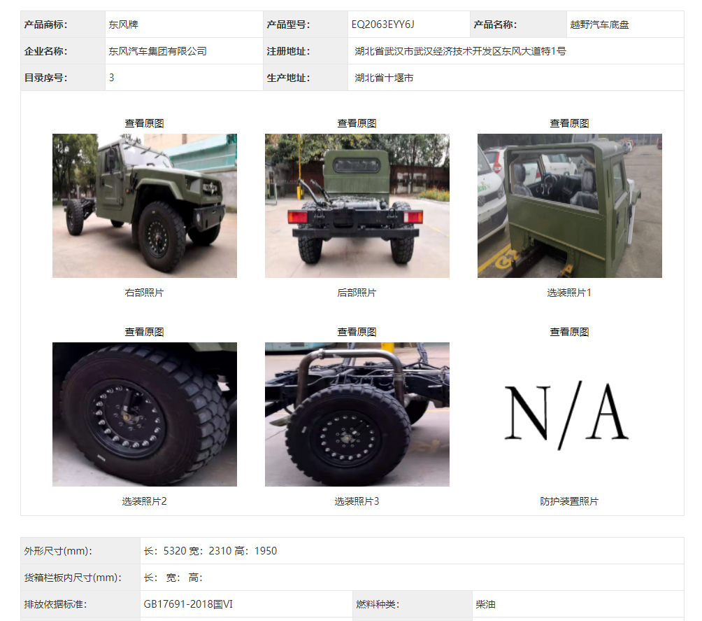 東風猛士民用版EQ2063EYY6J型長頭單排四驅(qū)越野底盤是東風越野車公司針對民用方面的首款軍轉(zhuǎn)民產(chǎn)品代表,其繼承東風軍用猛士的正規(guī)血統(tǒng),品質(zhì)優(yōu)異,技術過硬。東風猛士民用版EQ2063EYY6J采用東風猛士M50型四驅(qū)底盤改造而成,采用東風康明斯D4.0NS6B195型國六柴油發(fā)動機,195馬力 ,排量4L帶增壓,最大扭矩600/1100-2200(N.m/r/min);猛士5擋軍用手動變速箱;分動箱為四輪全時驅(qū)動帶高低擋;軸距3800mm;整備質(zhì)量3540kg;核定載質(zhì)量2460kg;輪胎采用305/80R18MPT全鋼子午線輪胎,帶自動中央充放氣系統(tǒng);整車總質(zhì)量6000kg,國六B排放全國可上黃牌,整車尺寸:5320*2310*1950mm;最小離地間隙388mm,最大垂直越障400mm,通過性強,適應高海拔極寒極熱地區(qū),全國暢行無阻,最高車速可達120km/h。