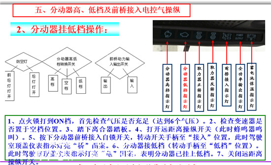 1、點(diǎn)火鎖打到ON檔,首先檢查氣壓是否充足(達(dá)到6個氣壓)。2、檢查變速器是否置于空檔位置。3、踏下離合器踏板。4、打開遠(yuǎn)距離操縱開關(guān)(此時(shí)蜂鳴器鳴叫)。5、按下分動器前橋接入自鎖開關(guān),轉(zhuǎn)動開關(guān)手柄至“接入”位置,此時(shí)駕駛室頂蓋儀表指示燈亮“橋”圖案。6、分動器接低檔(轉(zhuǎn)動手柄至“低檔”位置)。此時(shí)駕駛室頂蓋儀表指示燈亮“龜”圖案,表明分動器已掛上低檔。7、關(guān)閉遠(yuǎn)距離操縱開關(guān)。