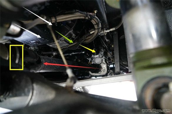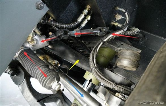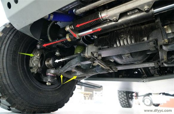 東風(fēng)四驅(qū)裝甲防雷反恐戰(zhàn)車(chē)為前置動(dòng)力、實(shí)時(shí)四輪驅(qū)動(dòng)設(shè)定,縱置發(fā)動(dòng)機(jī)(白色箭頭)直接與變速器(綠色箭頭)剛性連接,通過(guò)中間傳動(dòng)軸(黃色箭頭)至分動(dòng)器,在經(jīng)過(guò)前傳動(dòng)軸(紅色箭頭)與后傳動(dòng)軸將動(dòng)力輸出至前后驅(qū)動(dòng)橋。